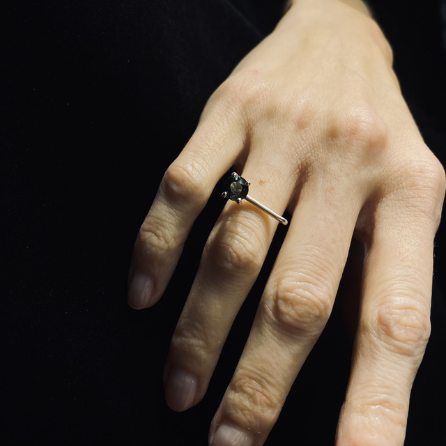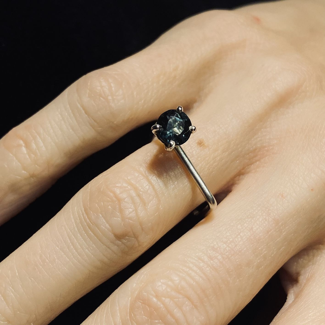 Anello quadrato sottile in argento 925 con incastonata una tormalina indigolite (color petrolio) a griffes. Misura 53.5 circa.