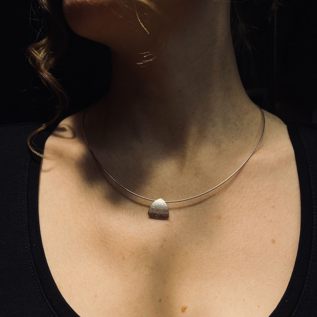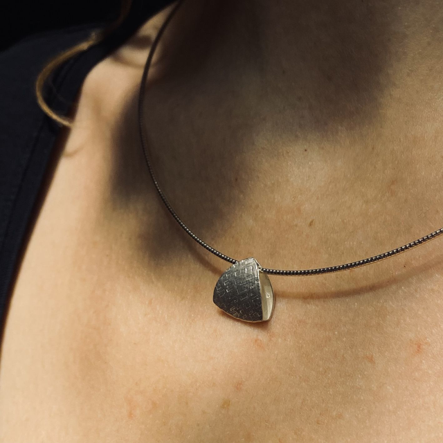 Ciondolo realizzato a mano in argento 925 con texture effetto quadratini. Girocollo semi-rigido compreso nel prezzo, sostituibile con catenina su richiesta (costo ciondolo 80.- / costo girocollo 30.-)
