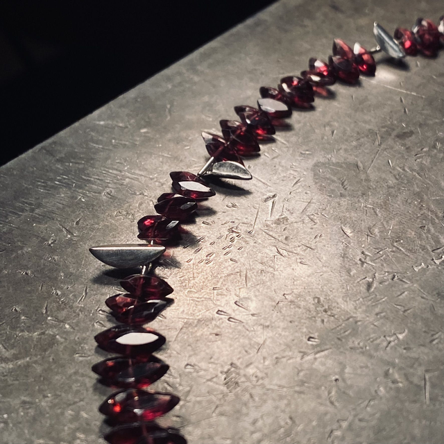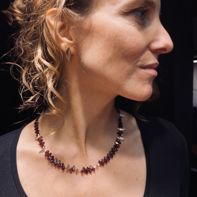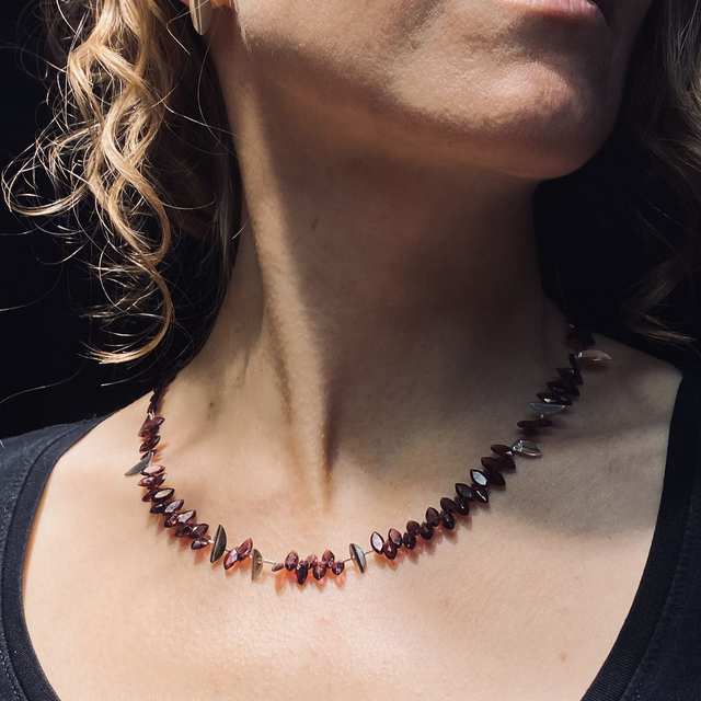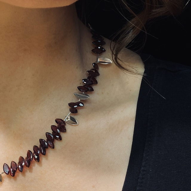 Collier elegante e moderno, dal disegno grafico e particolare. Realizzato a mano in argento 925 e pietre taglio navette di granato rosso.