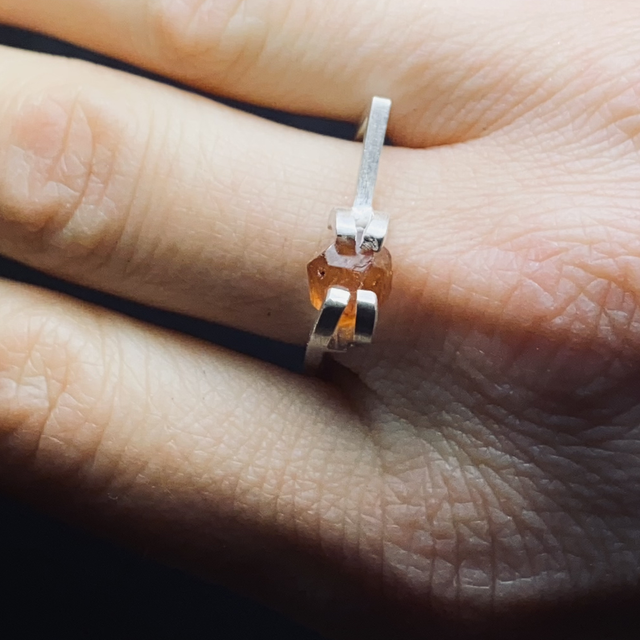 Anello quadrato realizzato a mano in argento 925 in filo sezione quadrata effetto satinato con doppia coppia di punte che incastonano un granato spessartina grezzo di colore arancione/rosso intenso.
