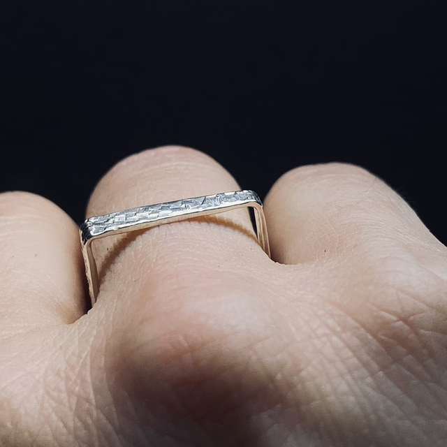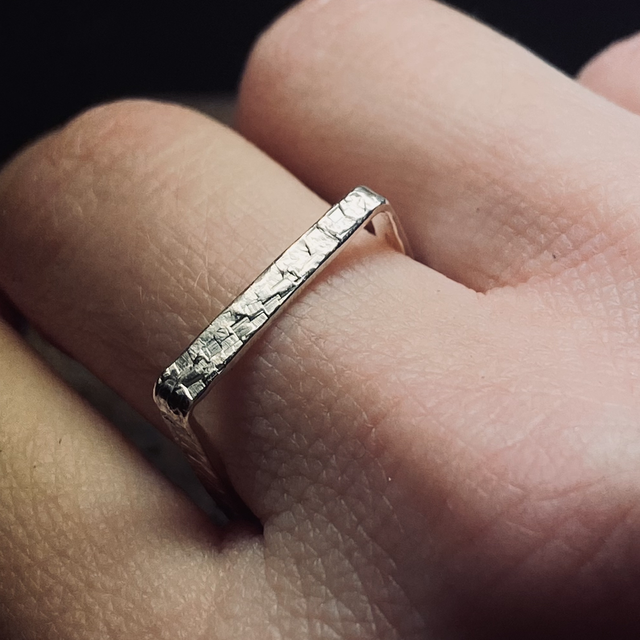 Anello realizzato a mano martellando l’argento 925 realizzando una fascetta larga circa 3mm.