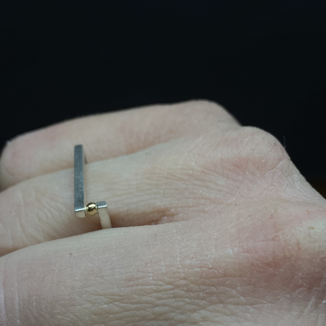 Anello quadrato realizzato a mano in argento 925 con filo sezione quadrata. Una piccola sferettina in oro giallo 18kt (750/1000) è saldata alla struttura ma sembra essere lì incastrata, un puntino sospeso…