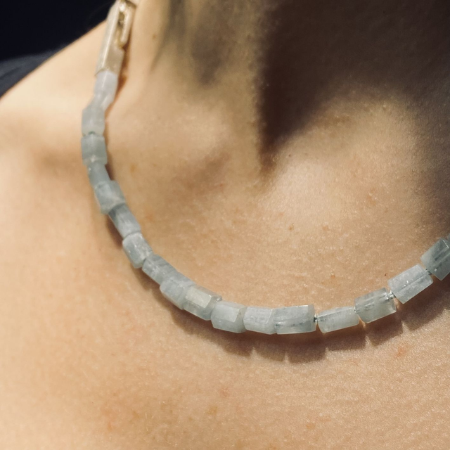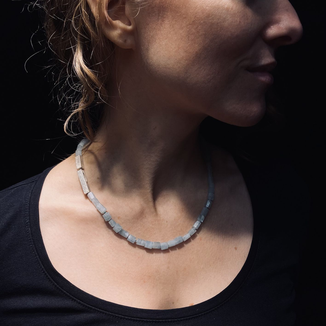 Collana con studio di chiusura in argento 925, rappresenta un labirinto dal quale cerchiamo di fuggire. Le due parti della chiusura si incastrano perfettamente e non rischiano di aprirsi. Pietre esagonali di acquamarina annodate accompagnano la micro scultura della chiusura.