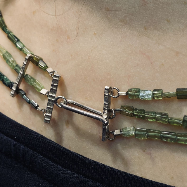 Collier molto elegante, una rivisitazione di un classico a tre fili con elementi realizzati a mano in argento 925 e fili di tormalina verde rettangolare.