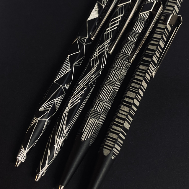 Penne Caran D’Ache incise a mano con motivi grafici.
